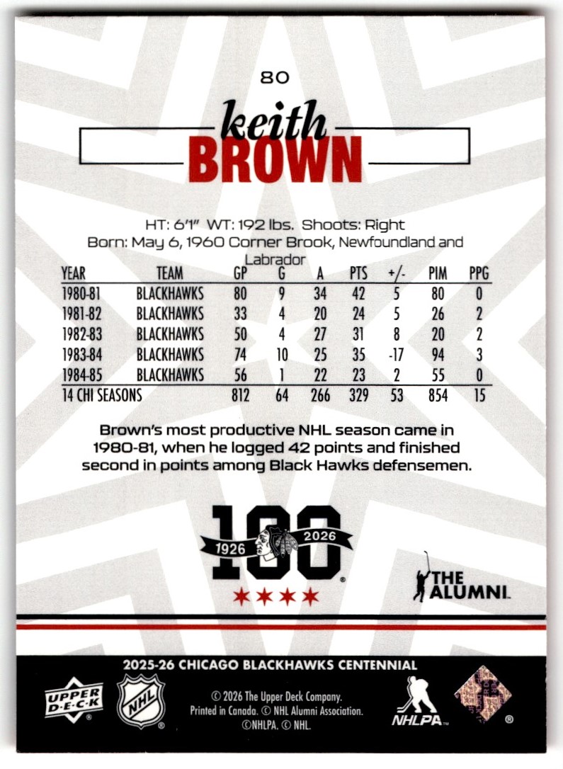 | Keith Brown 2025-26 UD Centennial Chicago Blackhawks Box Set #80 | ||||||||||||||