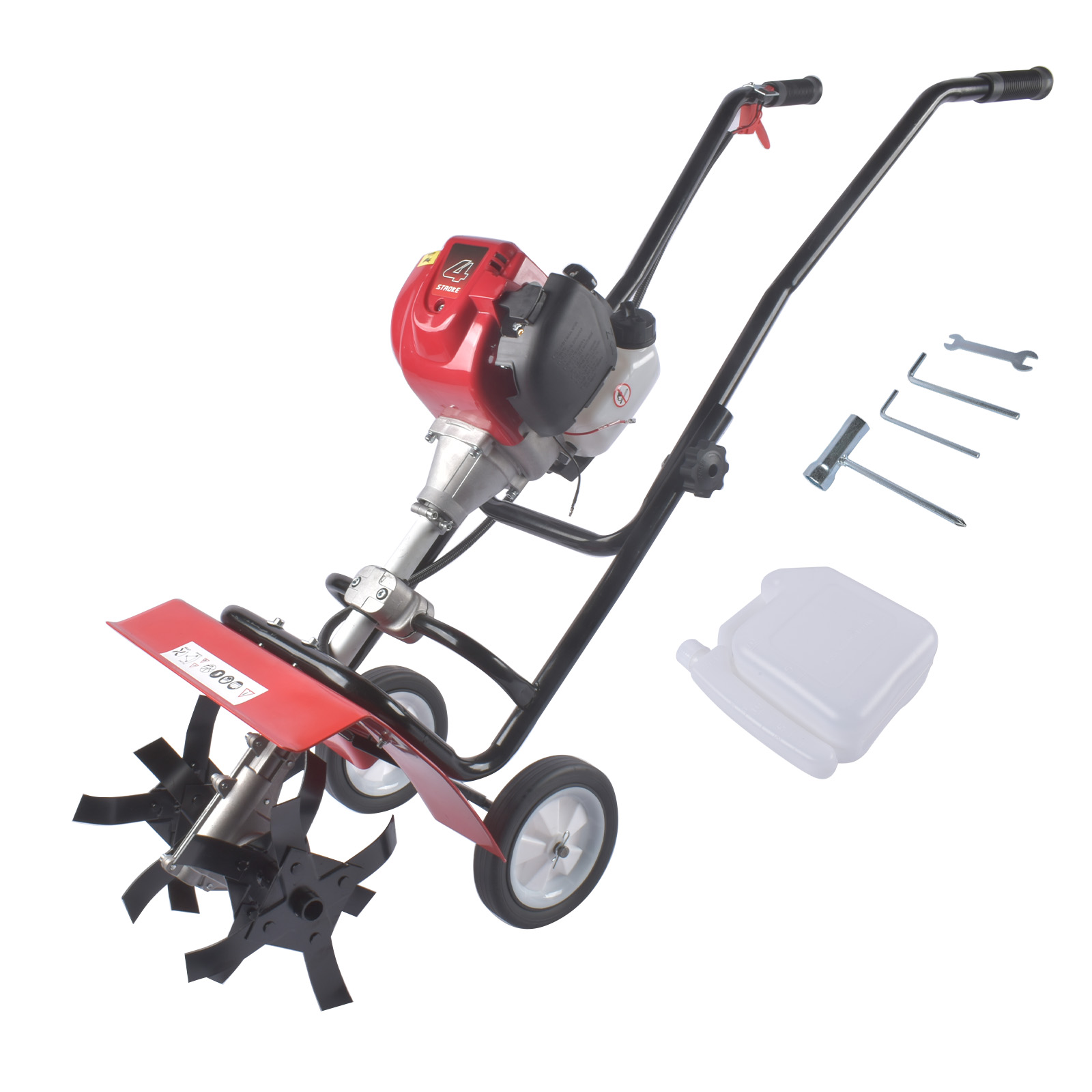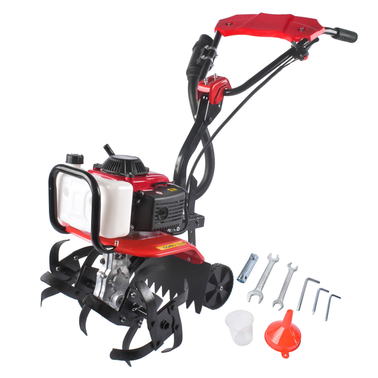 Package includes: 1x Tiller Cultivator, 1x Socket Wrench, 1x Funnel, 1x Cup, 2x Hex Key, 3x Allen Wrench, 1x Set of Installation Accessories