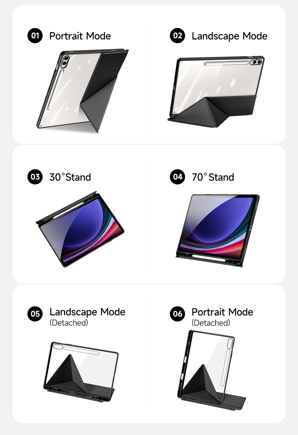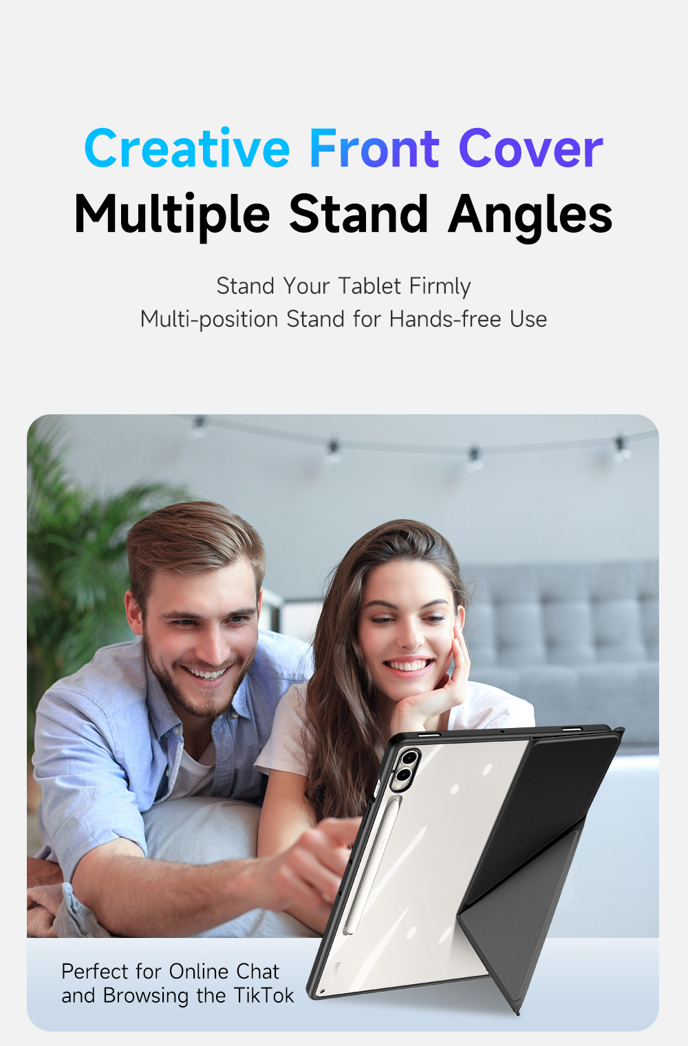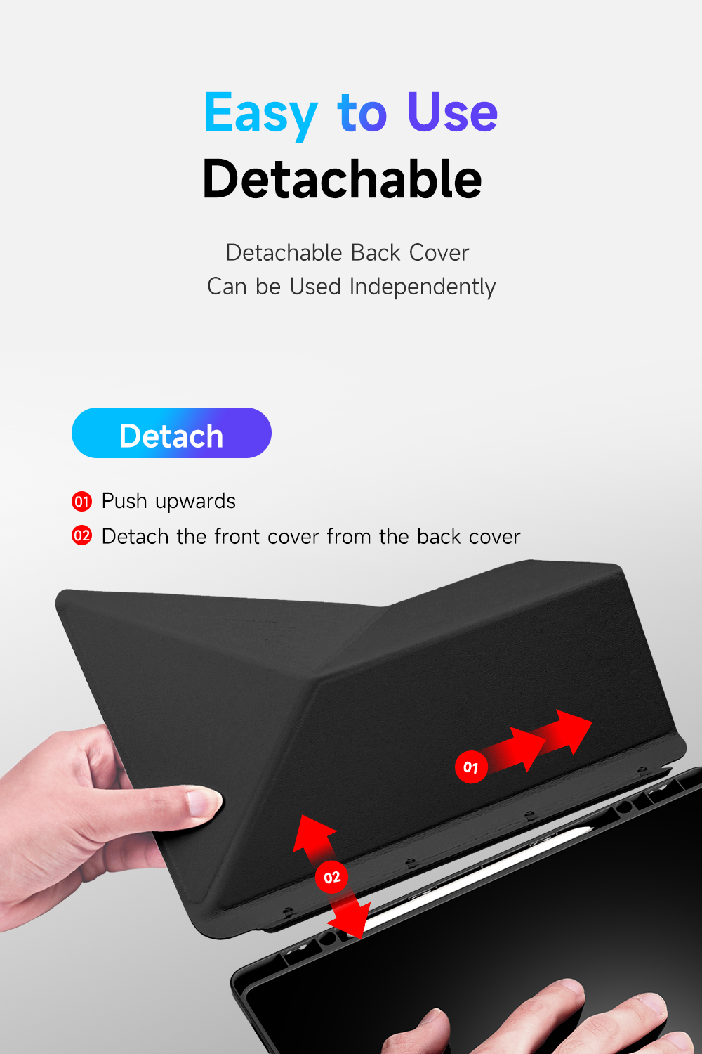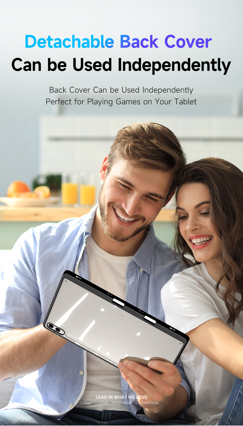 Creative front cover offers multiple stand angles to free your hands when viewing, browsing on the tablet. Clear back cover can be detached from the front cover and used independently, which is perfect for playing games on the tablet.
