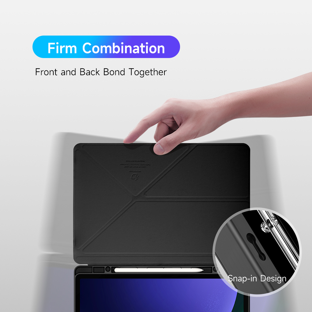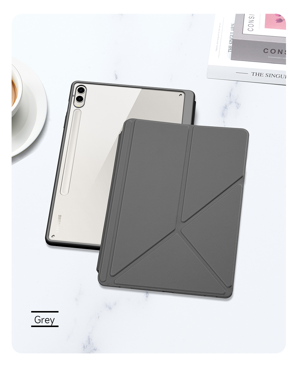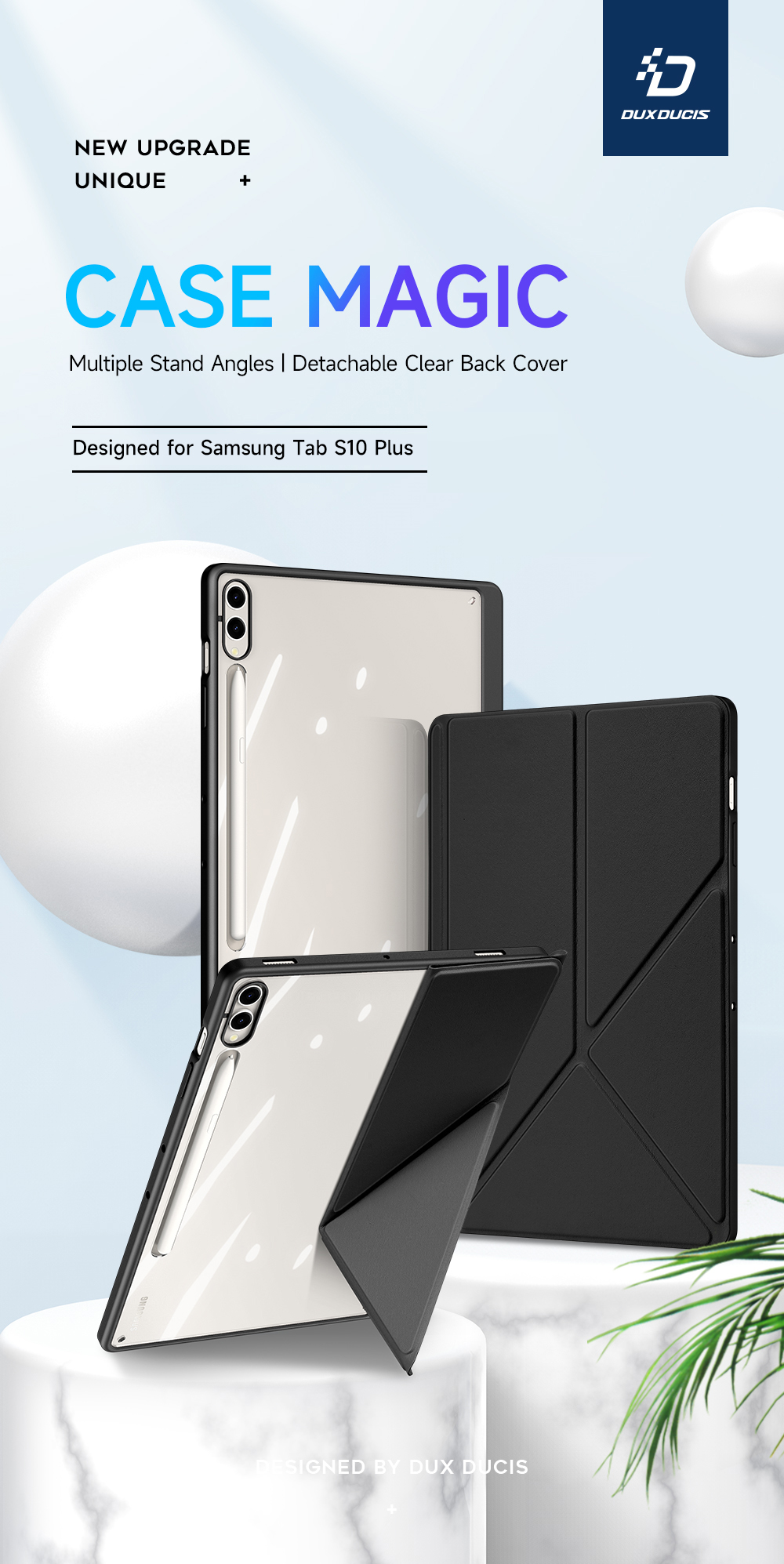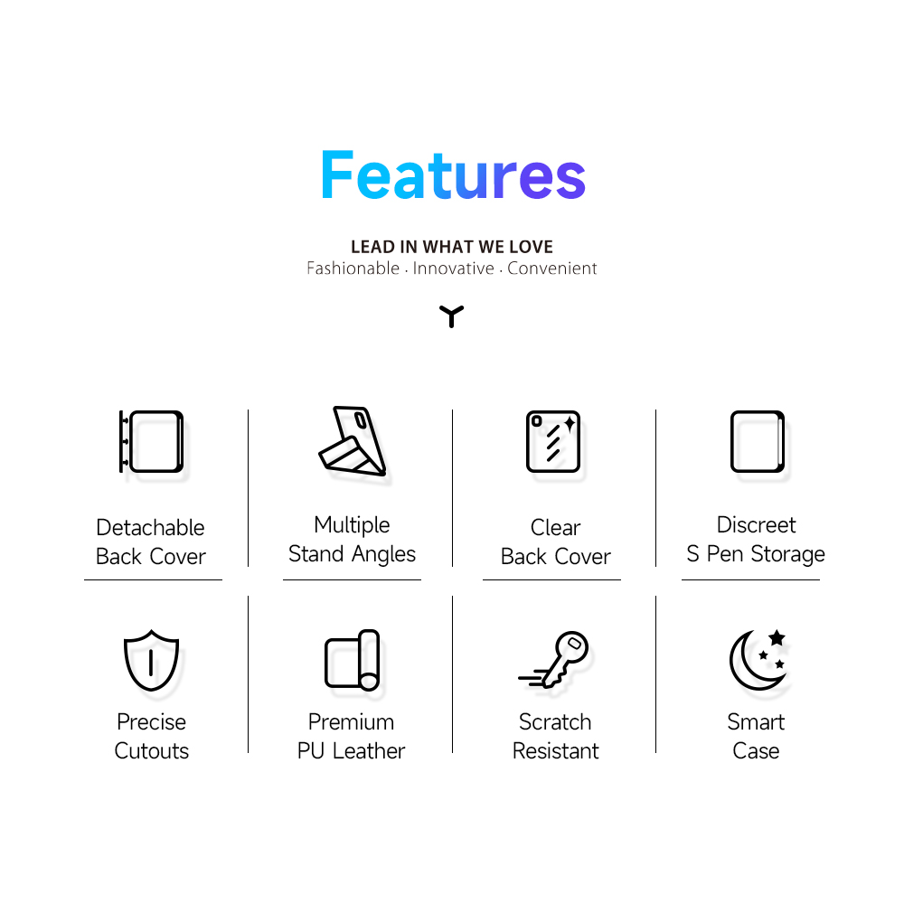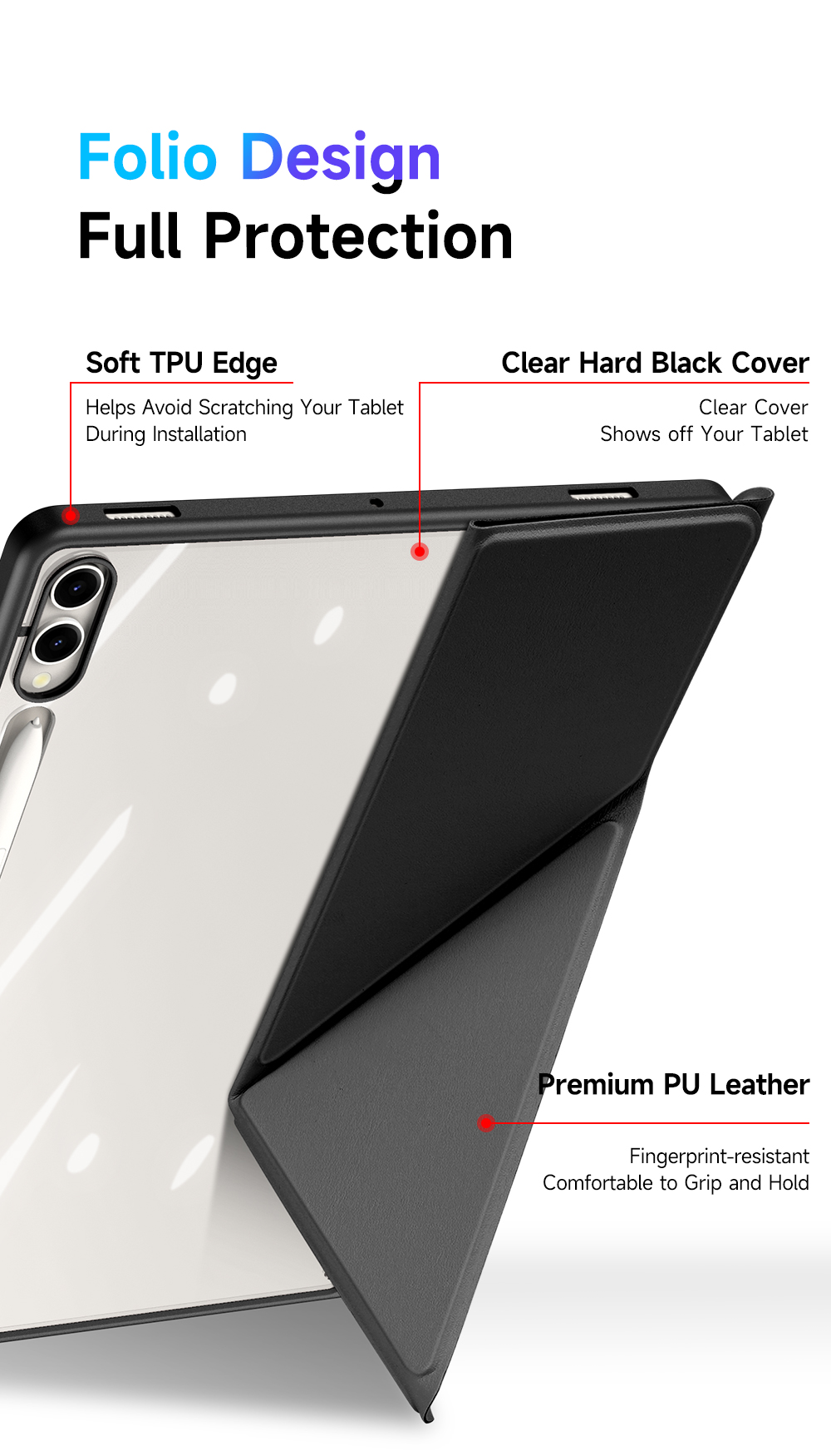 Creative front cover offers multiple stand angles to free your hands when viewing, browsing on the tablet. Clear back cover can be detached from the front cover and used independently, which is perfect for playing games on the tablet.