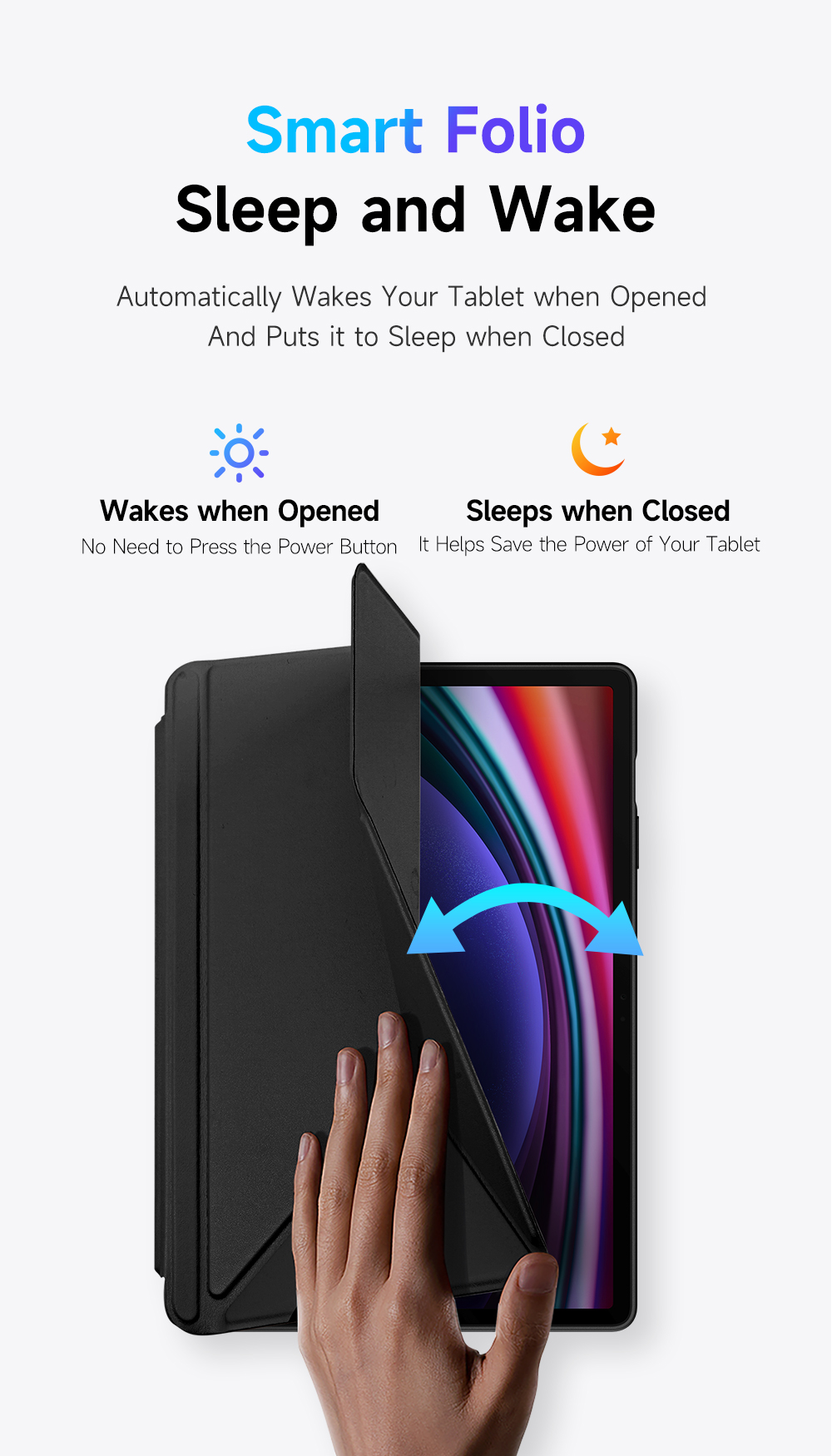 Smart folio offers wake/sleep function, it automatically wakes your tablet when opened and puts it to sleep when closed.