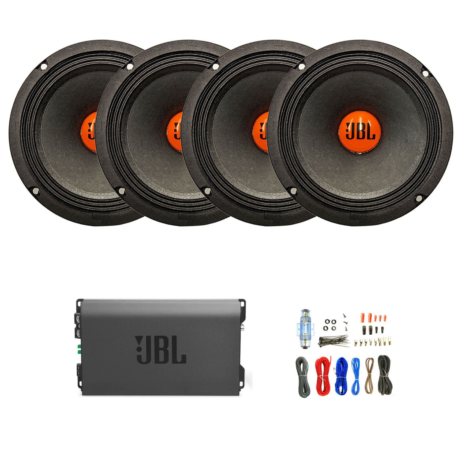 • PACKAGE BUNDLE INCLUDES: 2 Pair of JBL 6.5" 300 Watt Peak Power Midrange Car Audio Speakers, 4-Channel Amplifier with Install Kit