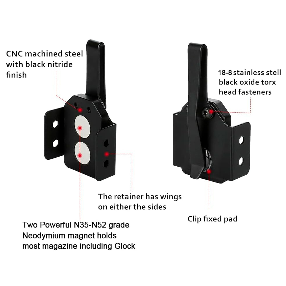 The use of TWO N35-N52 grade neodymium magnet,you can ensure your Glock magazine is securely held and completely concealed,producing eight pounds of pull at operating temperatures up to 100 degree Celsius,in addition to a N35-N52 grade neodymium magnet does a good job of holding the magazine,and not have it slip off and bounce around in a pocket.