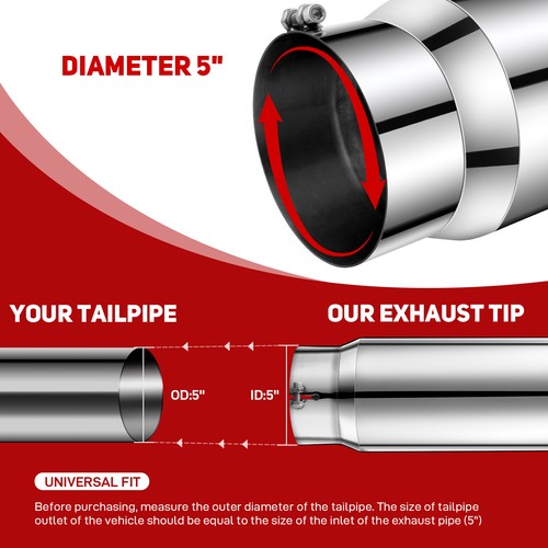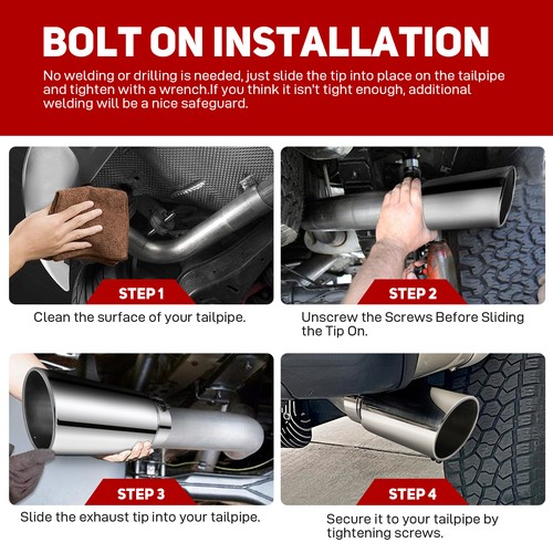 Features • Ideal for vehicles with diesel exhaust system. • Prevent the tail pipe deformation, to prevent the heat back. • Not easy to accumulate water. • Excellent resistance to corrosion and oxidation resistance. Easy to clean. • Enhance the appearance of your car. • Easy to install. Direct bolt-on without any modification. (No instruction included) (We suggest to tighten them periodically to avoid loose. Additional welding is required for secure installation.)