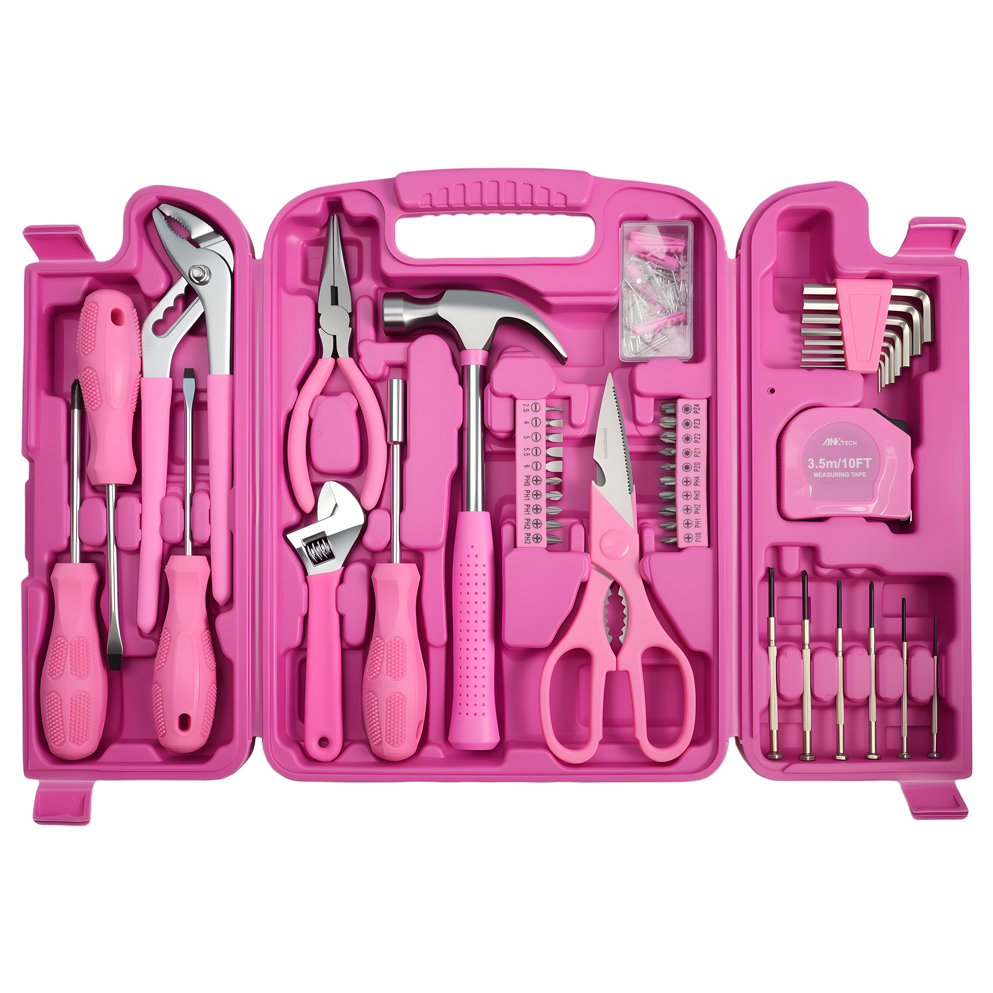 Complete set with hammer, screwdrivers, pliers, wrenches, scissors, measuring tape, and essential accessories. Compact, organized, and ready for home and garage repairs.