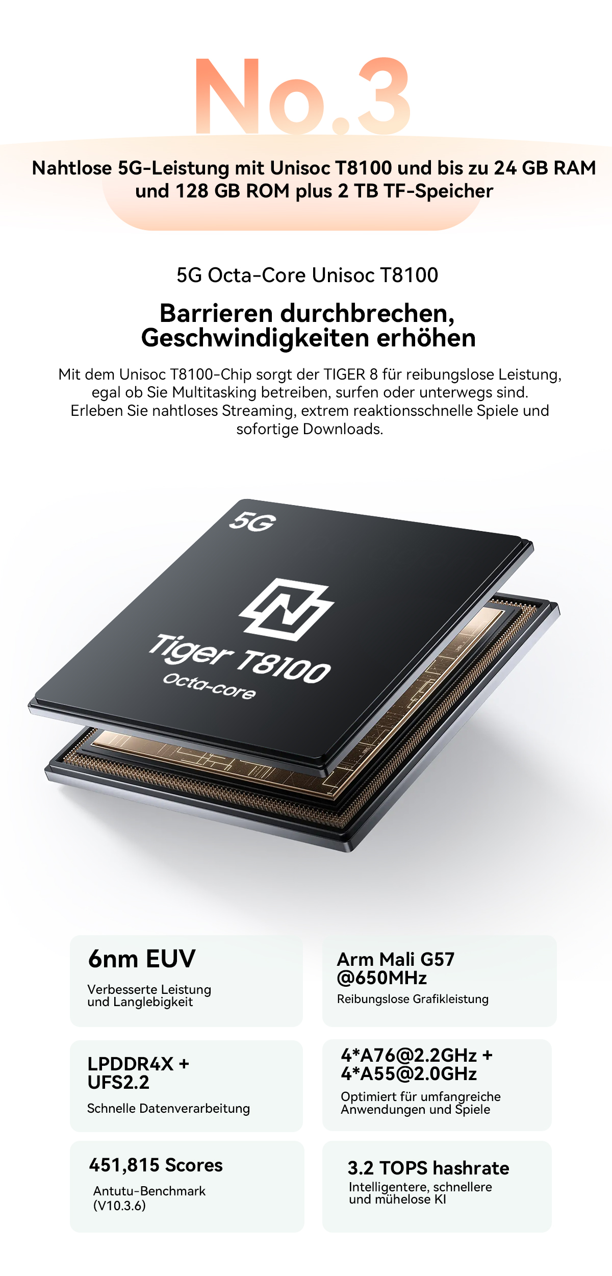 CPU ----------- Unisoc T8100,Octa Core, 4*A76@2.2GHz + 4*A55@2.0GHz