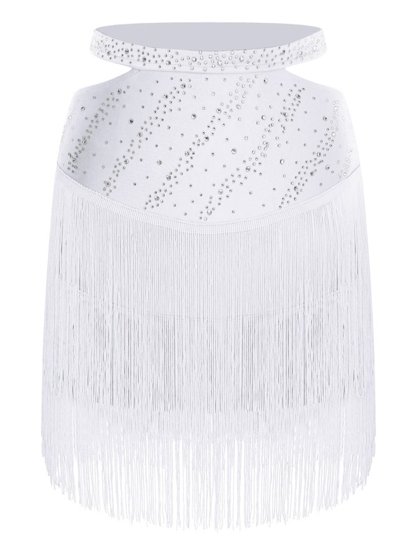 Shiny rhinestones and tassels adorn the skirt, adding a touch of glamour and sparkle that will make the wearer stand out on the dance floor.