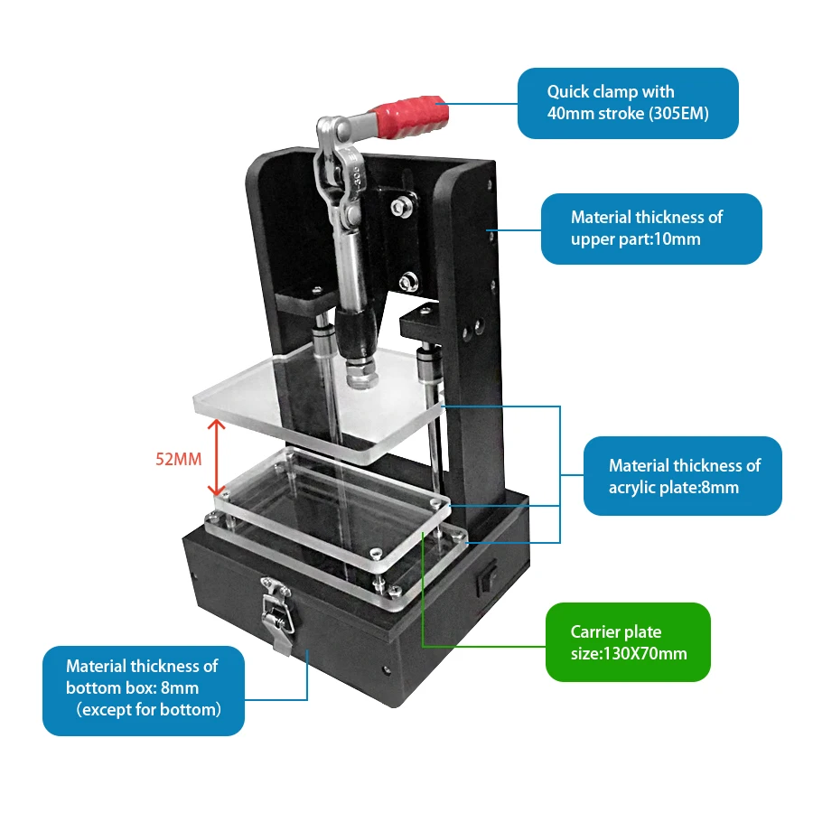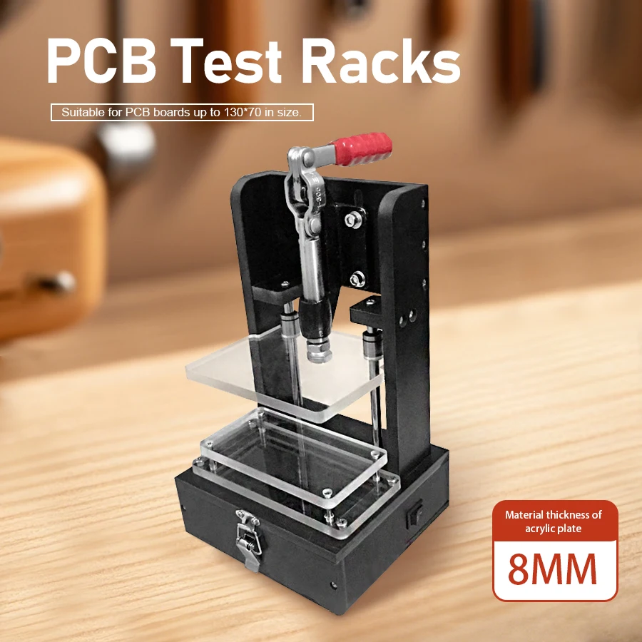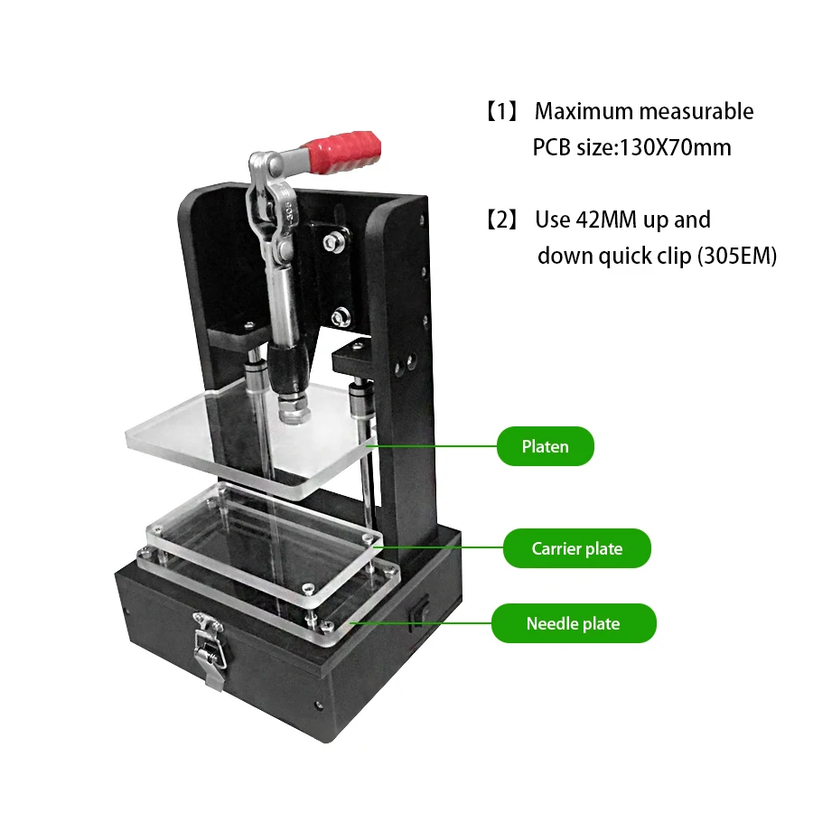 PCB Test Fixture, Universal Test Fixture 130_70B Base Frame Universal Fixture Dimensions: 160 x 145 x 291 mm Material: Bakelite Plastic Material: Bakelite/Polyoxymethylene (POM)