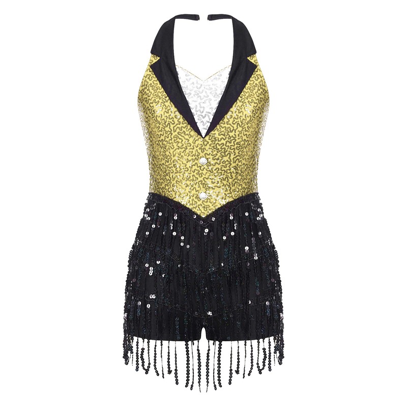 Women’s sleeveless dance leotard with shiny sequins and tassels to create an eye-catching effect and brighten up any performance.