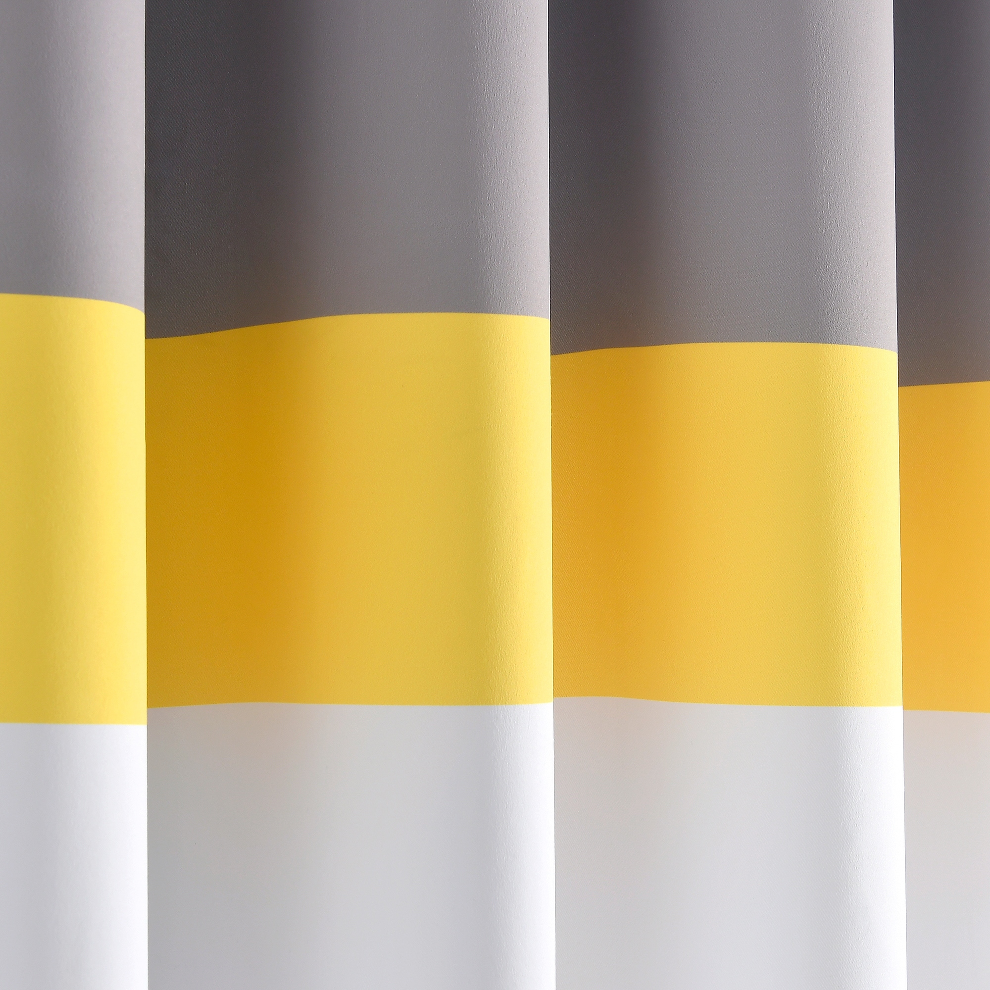 This color blocking window curtain is just what you need to add a touch of modern style to any room. The striped design is perfect for lending a contemporary, yet timeless feel to your space. The light filtering fabric allows you to enjoy some natural light while still maintaining your privacy. Simply hang this curtain using the metal grommets. The width of this curtain is 52 inches, and it is sold as a pair. Please refer to label for full care instructions.