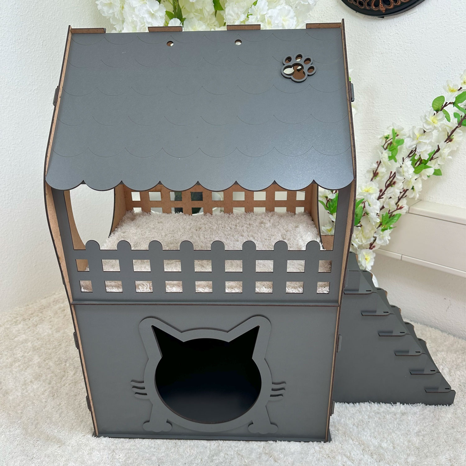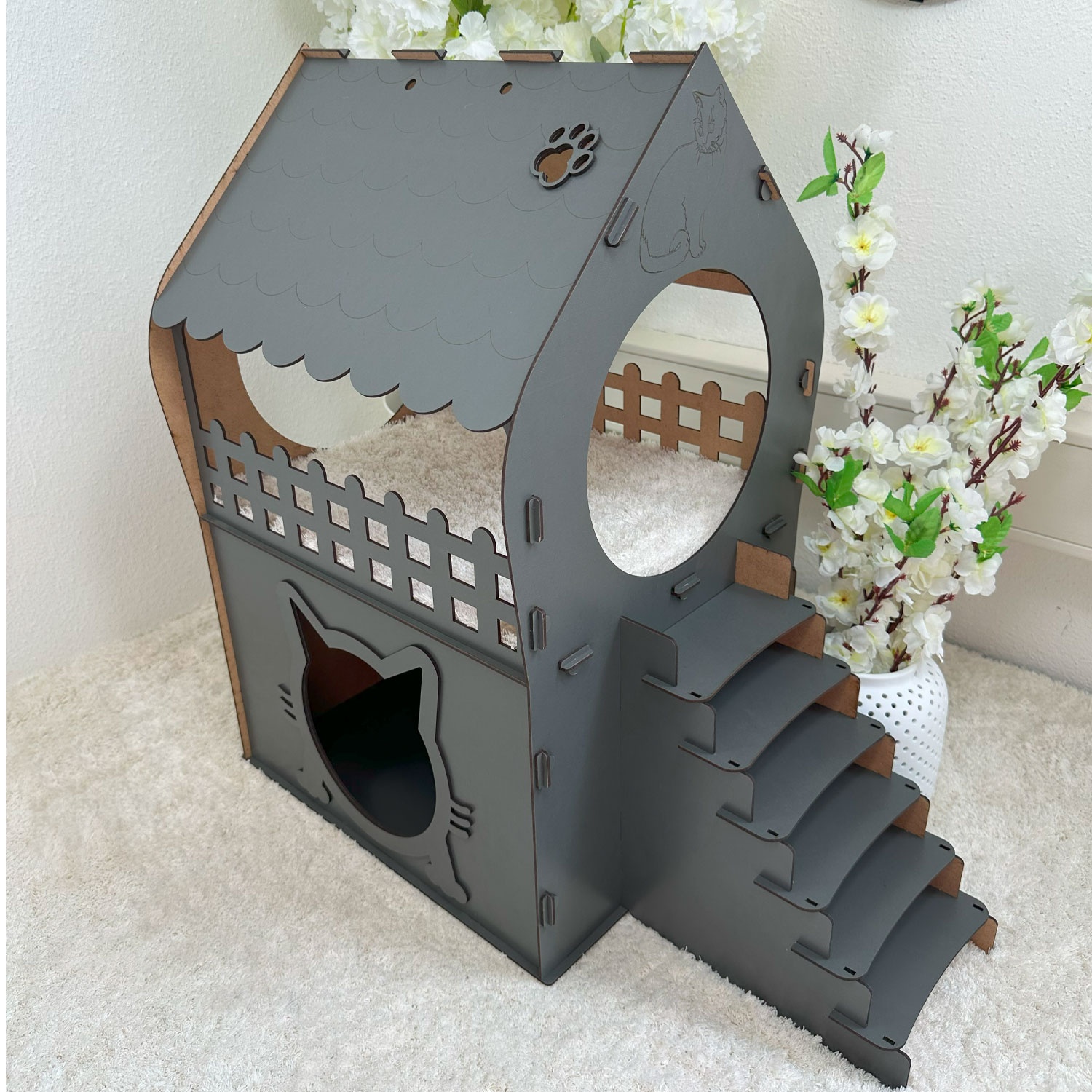 Zweistöckiges MDF Katzenhaus in Anthrazit – In 3 Größen (XL, XXL, 3XL) – Werkzeugloser Aufbau