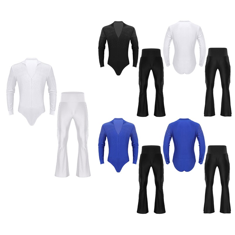 Crew neck, long sleeve, high wait, elastic waistband, ankle length bodysuit, front zipper closure.