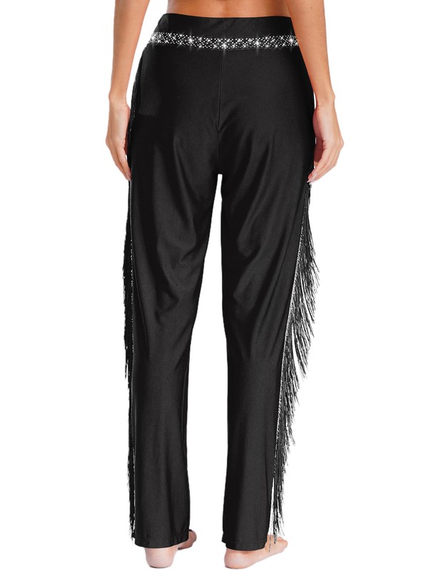Women’s dance pants with tassels and shiny rhinestones are eye-catching enough to make you the spotlight in any performance.