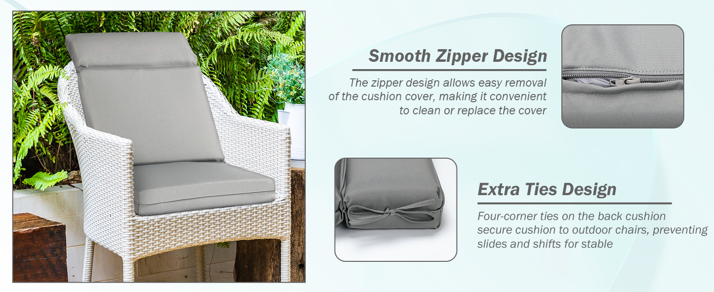 【PRACTICAL DETAILS】- Our patio cushions feature two adjustable straps on each side of the headrest and backrest, ensuring convenient and secure assembly. The hidden zippers prevent water seepage at seams and facilitate easy removal for cleaning.