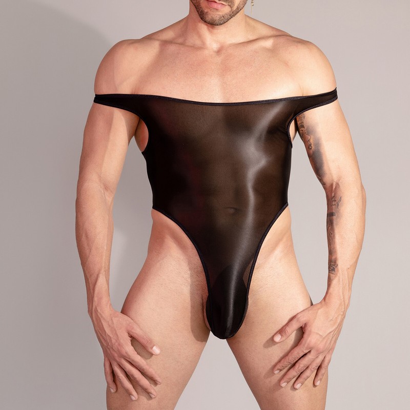 High-cut and slim-fit jumpsuit enhances your muscle lines and robust body. Oil-shiny surface adds endless temptation and sex.