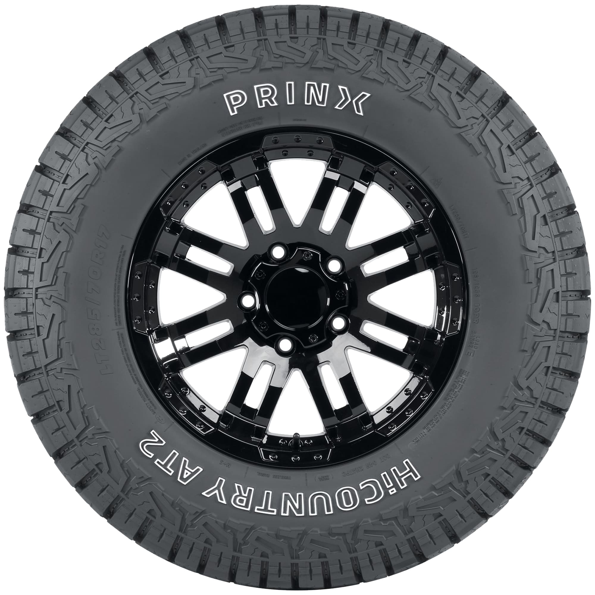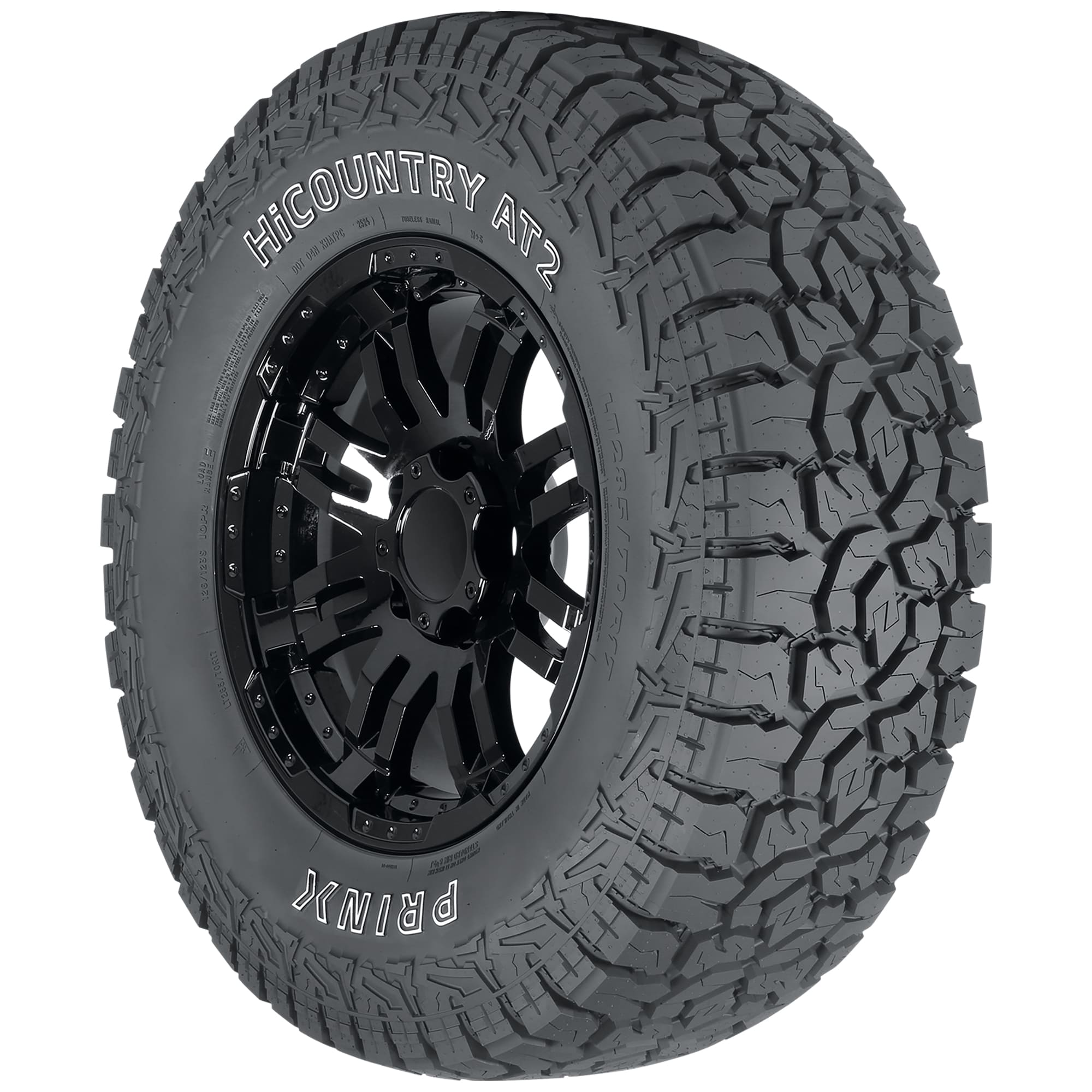 The Prinx HiCountry A/T2 is an all-terrain tire built for SUVs, Jeeps, and light trucks, providing strong on- and off-road traction year-round. You'll experience stable rides, enhanced durability, and superior damage resistance, all backed by a 50,000-mile limited manufacturer tread life warranty. This tire features Pattern Noise Simulation (PNS) for noticeably quieter and more comfortable rides, even with its aggressive capabilities. Its aggressive tread design boosts both stability and traction, whether you're on the highway or hitting the trails. Plus, the robust sidewall construction helps prevent punctures and ensures long-lasting durability in demanding conditions.