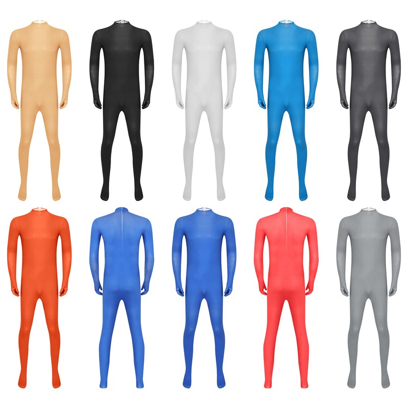 Full-body unitard is designed with stand collar, long sleeve, integrated gloves and sock, back zipper closure, slim fit and solid color.