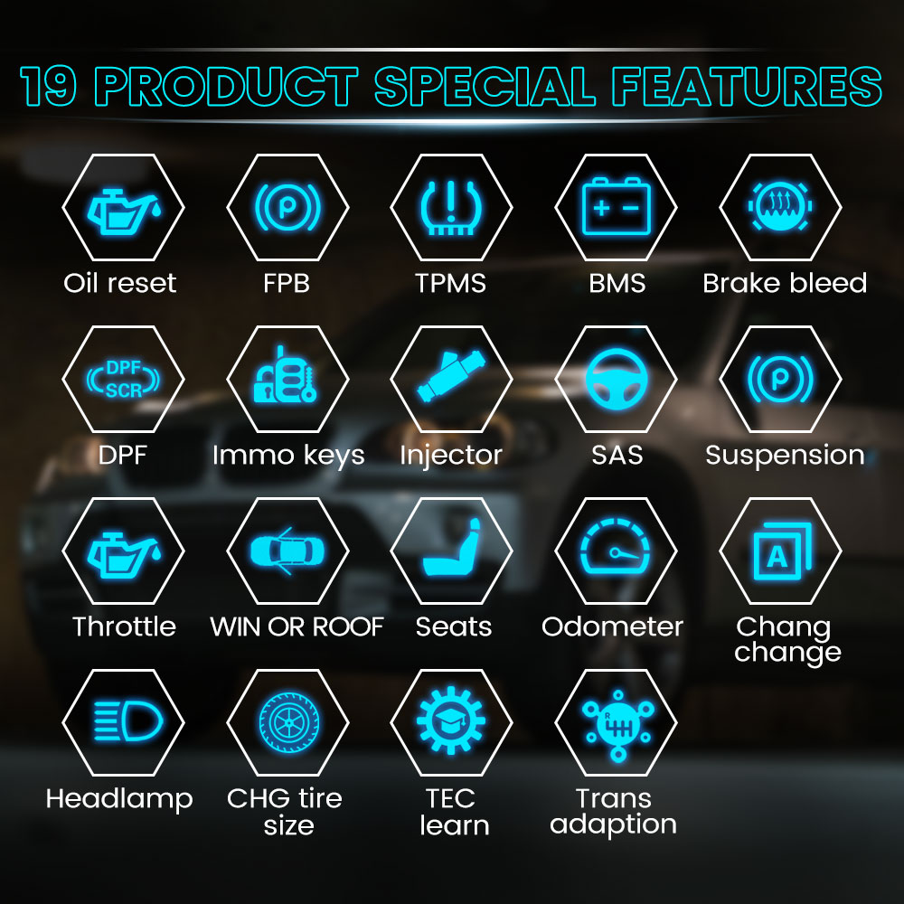 5. Support up to 19 specific functions, including Oil Reset, EPB, BMS, SAS, TPMS, IMMO, etc.
