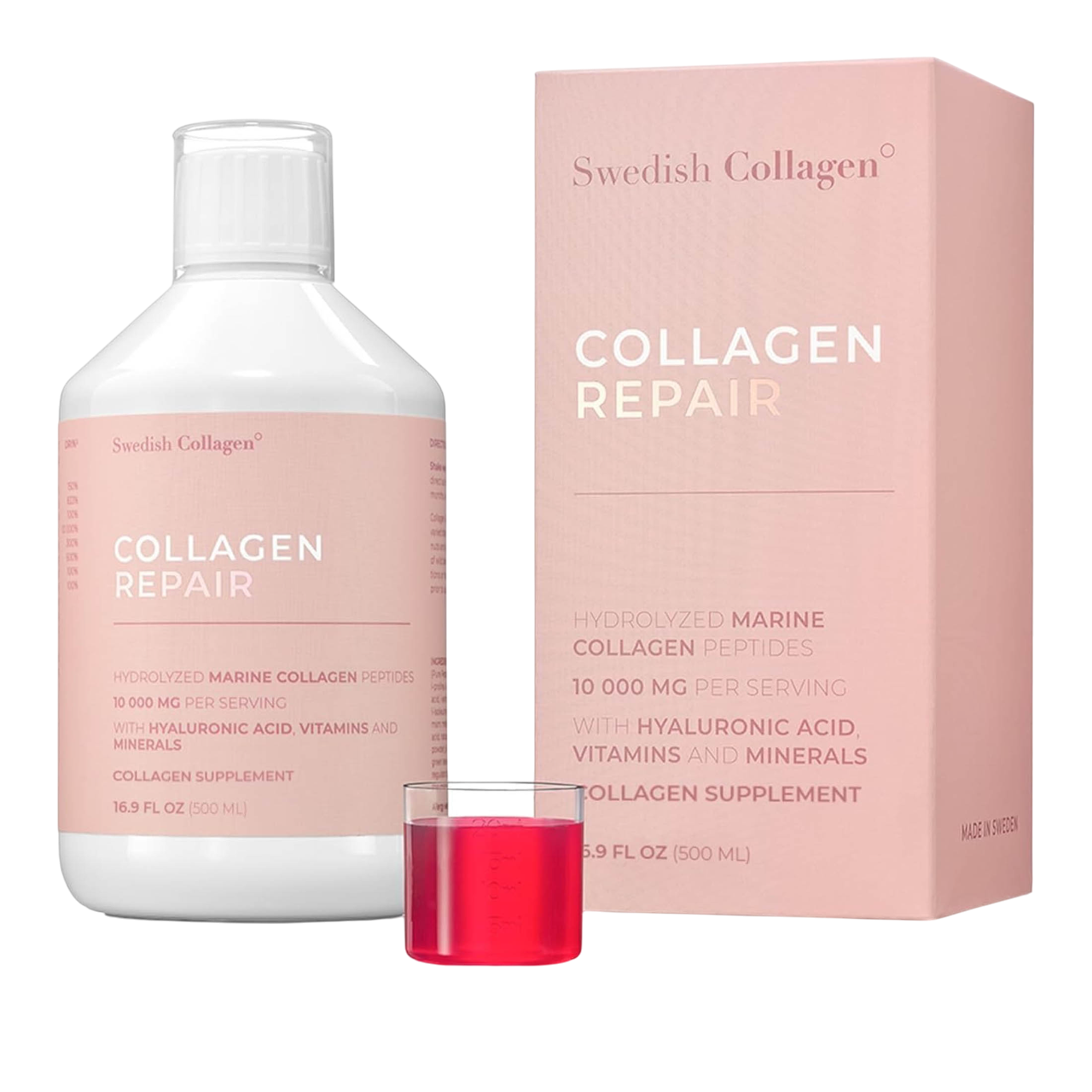 Swedish Collagen Repair is an advanced liquid collagen supplement designed to rejuvenate your skin, strengthen hair and nails, and combat the visible signs of aging. Formulated with 10,000 mg of nano-hydrolyzed marine collagen peptides (type I & III) and enriched with hyaluronic acid, essential vitamins, and minerals, this premium daily elixir supports natural collagen production and skin renewal from within.