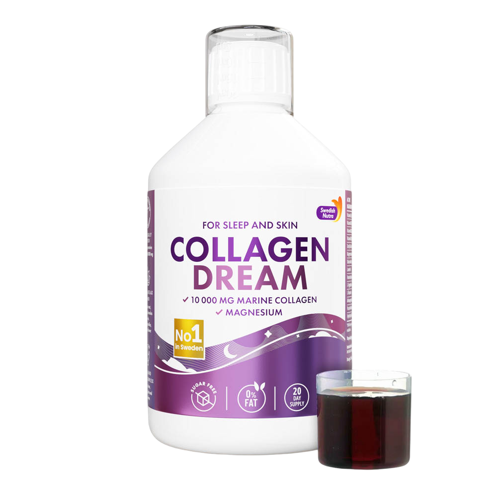 Swedish Nutra Collagen Dream is a unique liquid food supplement designed to support healthy skin, hair, nails, joints, and bones while promoting relaxation, mental well-being, and restful sleep.