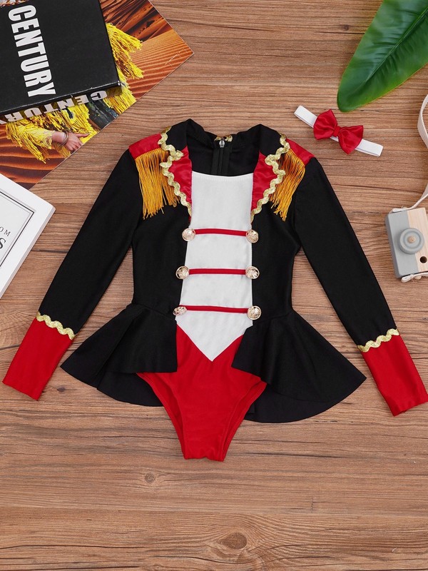 Long sleeve, lapel leotard is designed with tassel shoulder, hidden back zipper closure.