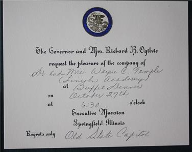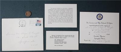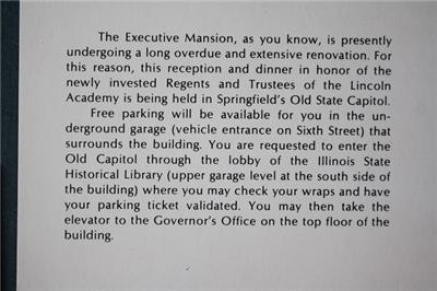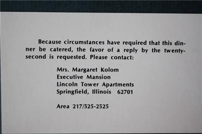 Check it out...Here's a classic & VERY UNCOMMON @ 4 1/4" wide by 3 1/2" tall official invitation, 4 1/2" wide by 3 1/4" tall notification card, 4 1/2" wide by 2 1/2" tall catering card & envelope set from a 1971 dinner reception announcing renovations at the Executive Mansion forcing a change to a reception which will now be will be held at the Old State Capitol in Springfield, Illinois hosted by Governor Richard Ogilvie on October 27, 1971-Set comes in the original envelope too-Great vintage historic item in great condition with minor wear consistent with age and normal use. Really a cool little set-I can't imagine many examples survive today-(See photos below for clarification)-This is an ORIGINAL item, NOT A REPRODUCTION item! Postage information is listed at the bottom-$ 5.95 postage is required.