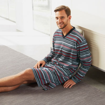 Erwin Müller Single-Jersey Herren-Nachthemd. Optisch und qualitativ überzeugt die bequeme Nachtwäsche auf ganzer Linie. Sie ist klassisch geschnitten, mit sportlich gestrickten Ringeln und hat einen V-Ausschnitt. Gerne lassen Sie sich von dem angenehmen Tragekomfort verwöhnen.
