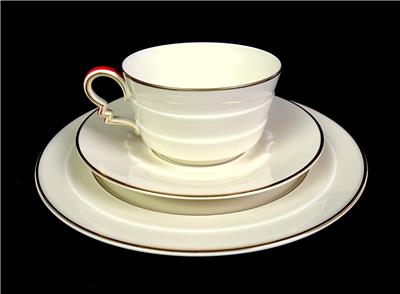 These are in Excellent Condition with No Chips No Cracks No Crazing. Very Nice Rosenthal Bavaria Porcelain Cup and Saucer Trios. This is from the Madeline series in an art deco style. The plate and cup are banded with the cup having a zig zag handle red accents. The saucer has a embossed stylized scalloped pattern around the center. Each piece has gold trim and accents.