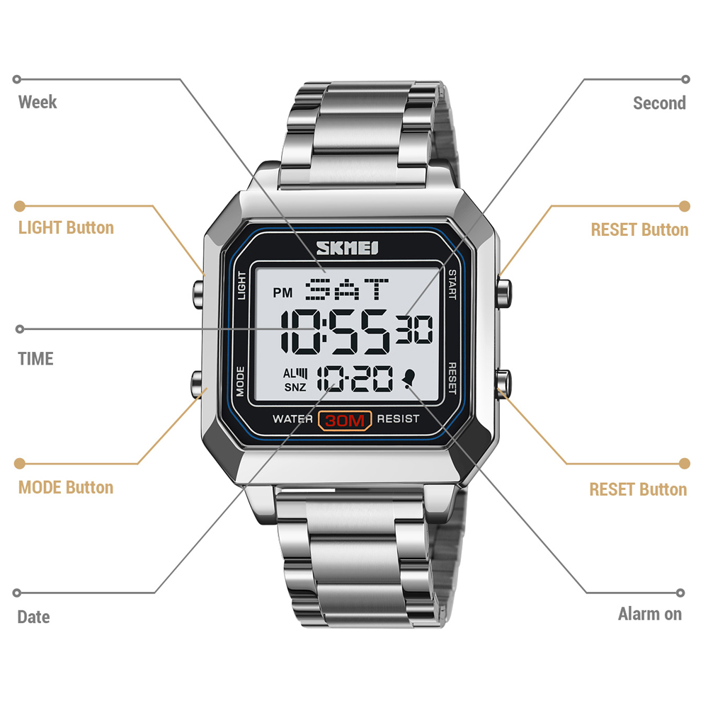 Function: 2Time, Chronograph, Countdown, Alarm, Date, Week, LED Light, 12/24 hour.