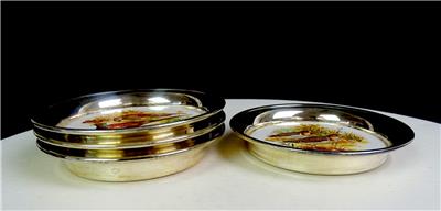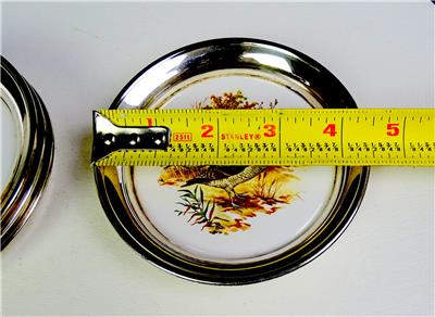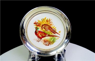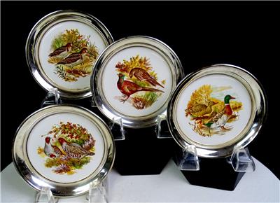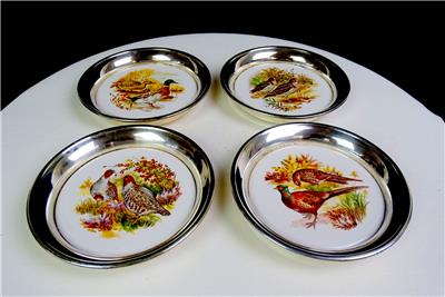 Set Of Four Taunton Silversmiths Silverplate & Porcelain Game Birds 4 3/8" Coasters 1970s