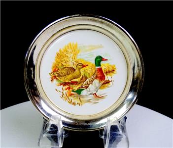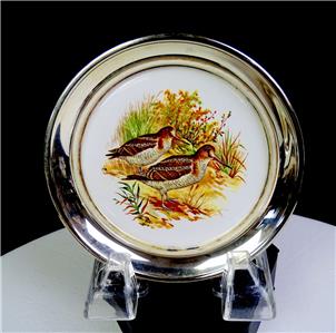These are in Excellent Condition with No Chips No Cracks. Very Nice Taunton Silversmiths Coasters. These feature porcelain centers with each decorated in a different male and female game bird. They rest inside silver plated holders with flared and rolled rims. The bases have a concentric ring pattern.
