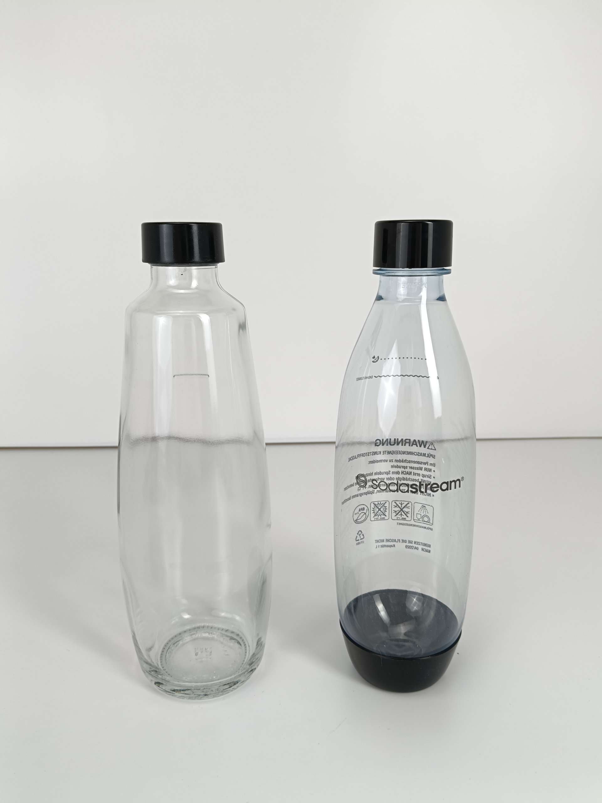 Buvez de l'eau gazeuse à la maison dans une bouteille en verre et en voyage dans une bouteille en plastique.