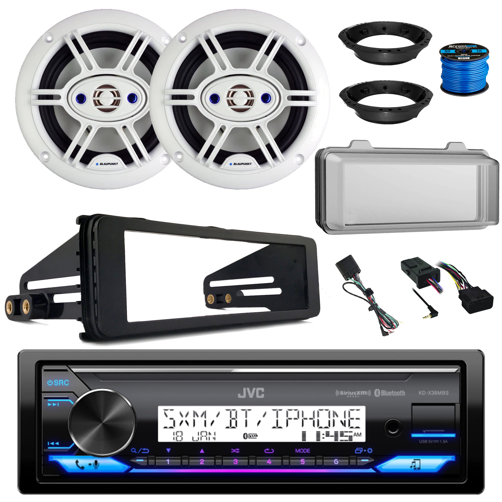 • PACKAGE BUNDLE INCLUDES: JVC KD-X38MBS Single DIN Marine Bluetooth AM/FM Stereo Receiver, Radio Cover, 2x 6.5" 240 Watt Outdoor Speakers (White) w/ Adapter, Wire, Handlebar Control Kit, 1998-2013 Harley Dash Install Kit