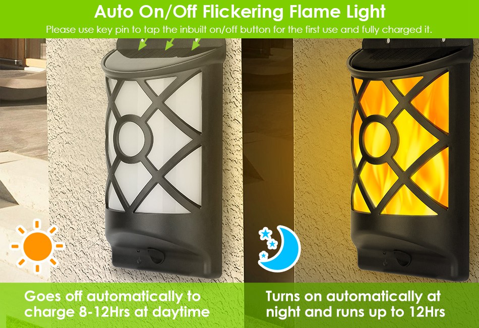 - *AUTO ON/OFF:With sensitive light sensor,our flame Solar light will turn off and charge automatically during the day. Then turn on the light automatically at dusk and turn it off when it's dawn. Use the included key pin to tap the inbuilt on/off button for the first use and fully charged it.