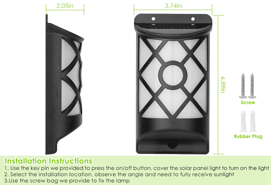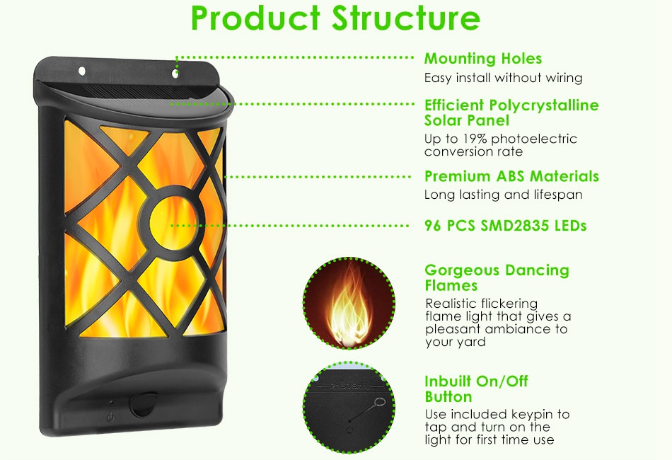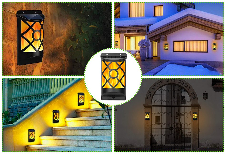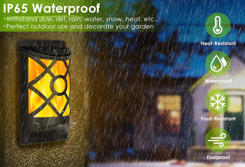 Flame Solar Lights Outdoor 96 LEDs Waterproof Flickering Flame Wall Mount Lamp Product Detail Image Gallery Product DescriptionOverview:Our flame solar lights, built-in 96LEDs cast realistic flickering flame lighting effect, add romantic atmosphere to your BBQ, front door or party, a landscape light decorates your home. Built-in a sensitive light sensor, it auto turns off during the day and turns on at night. Its solar panel with 19% high photoelectric conversion can effectively absorb the sunlight on the day and convert sunlight into electricity to fully charge the inbuilt 1200mAh battery about 8-12Hrs. Light your garden up to 12Hrs. IP65 Waterproof and dust-proof performance, can withstand bad weather and free use in outdoors. Features:- *GORGEOUS DANCING FLAMES DESIGN:Built-in 96 LEDs illuminate and cast a soft realistic flickering flame light that gives a pleasant ambiance to your yard,garden,patio,etc. and add romantic atmosphere to your parties,holidays,BBQ,etc. It’s so lifelike that from 10ft away your guest can’t tell whether it’s a real flame or not.
