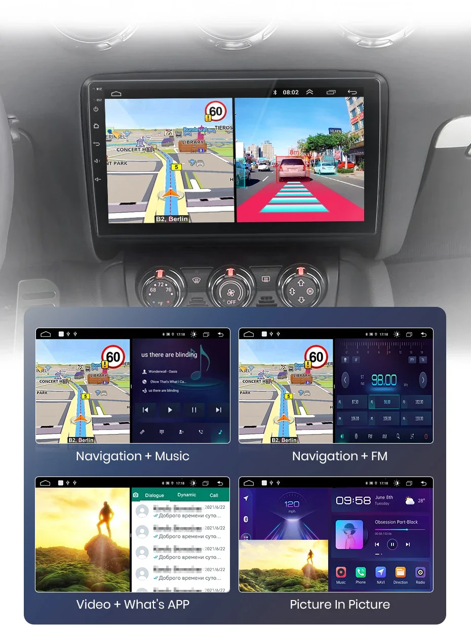 >> La radio pasa entre los métodos diurnos y nocturnos utilizando los faros del automóvil para ajustar el brillo general de la pantalla para adaptarse al entorno circundante. Las funciones comunes se integran en el escritorio, le permite pasar de navegación, música, bluetoo-ja llamado y otras características comunes con un solo clic. El diseño personalizado de la interfaz de usuario de Junsun mejora la practicidad y la seguridad durante su viaje;