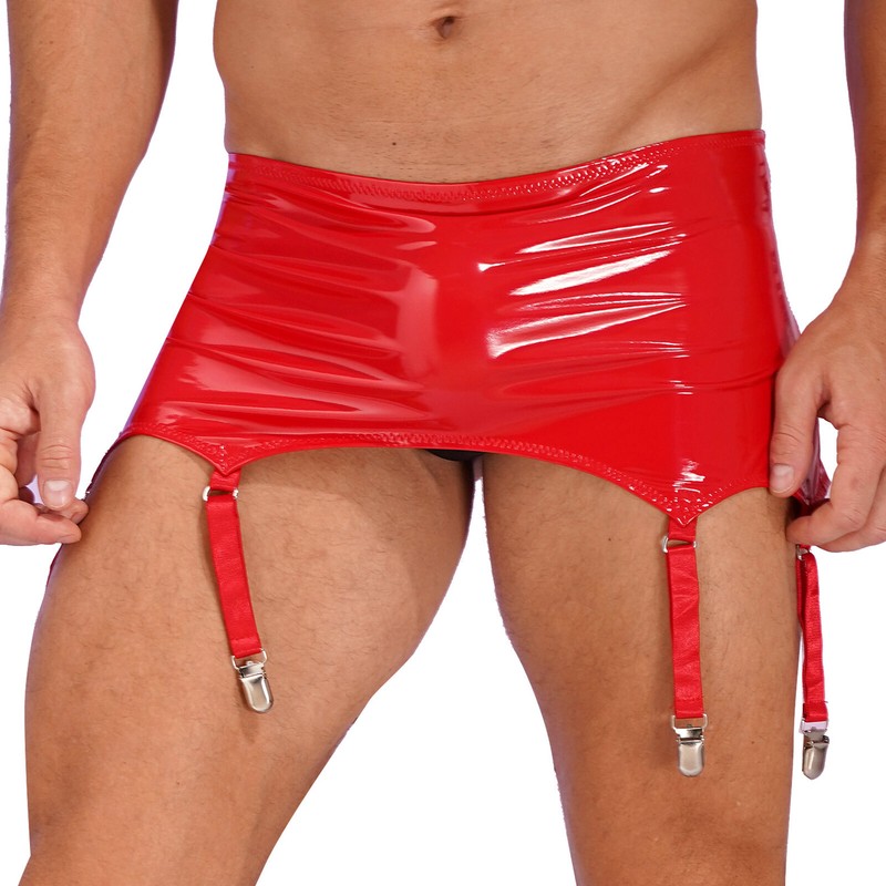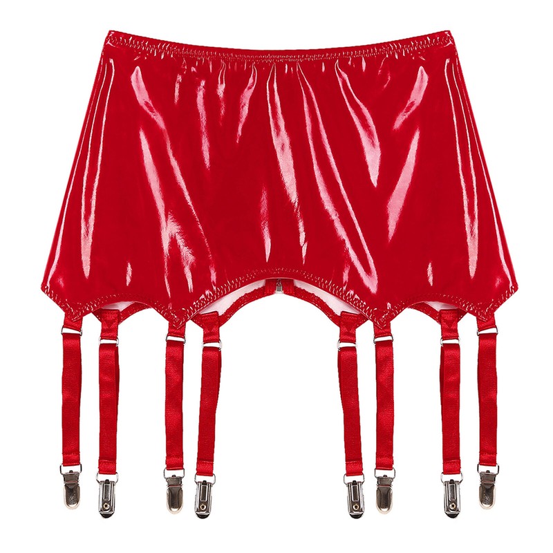 Wet look patent leather garters with metal clips keeps stockings in place.