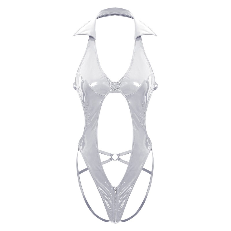 One-piece patent leather lingerie for women, turnover collar, deep v neck, sleeveless, backless and butt flaunting.