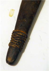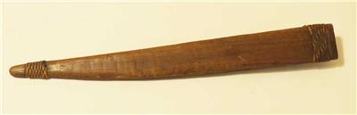 Construction: carved hardwood sheath with braided rattan lashings; gently raised throat to capture the guard; tapered profile to a rounded, bound tip