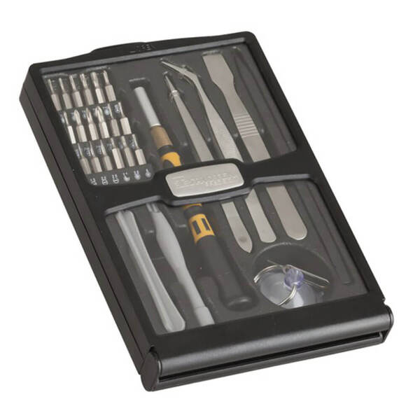 A kit containing all the necessary tools you need to fix your Smartphone. This 27 piece Smartphone repair tool kit comes in a compact storage case with a hang tab to make sure that you don't misplace the kit after use. It is not limited to Smartphones either - it is designed to repair iMac, Mac air, iPhone, Samsung, HTC, Nokia, Sony as well as many brands of mobile phone.