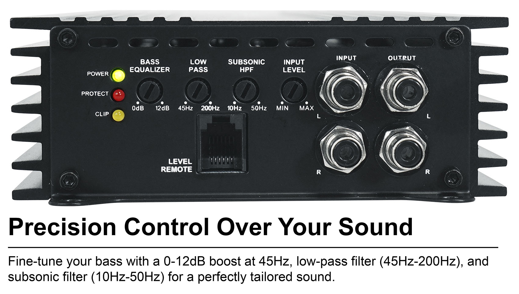 We include a high quality metal bass remote with a clipping indicator that allows you to easily increase your bass to its max level before distortion in real time. (This changes from song to song depending on the crest factor of your song). Some of the competing amps do not even have a clipping indicator on the actual amp which can cause you to blow your subs.
