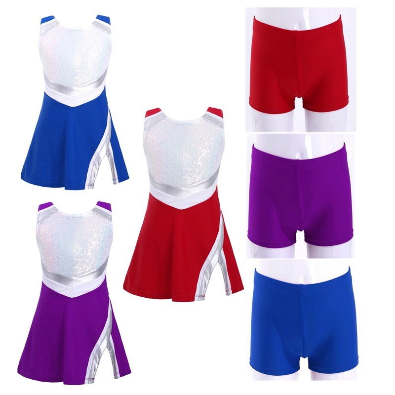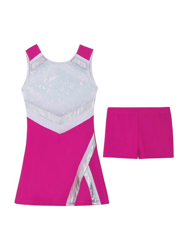 2Pcs Kids Girls Round Neck Sleeveless Shiny Sequins Adorned Bodice Sport Dress with Shorts Set.