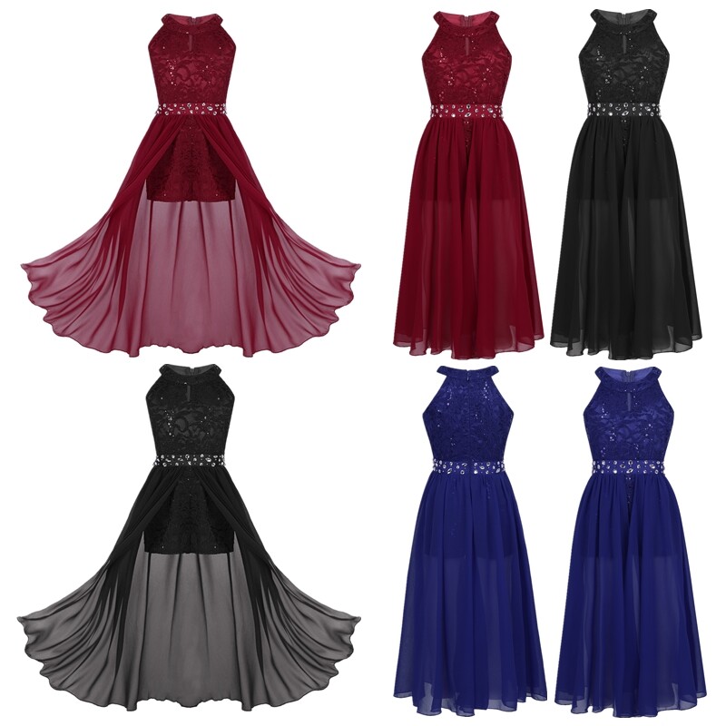 Sequin waistline attaches with high-low chiffon hem; flowy skirt echoes with ribbon, eye-catching and unique.
