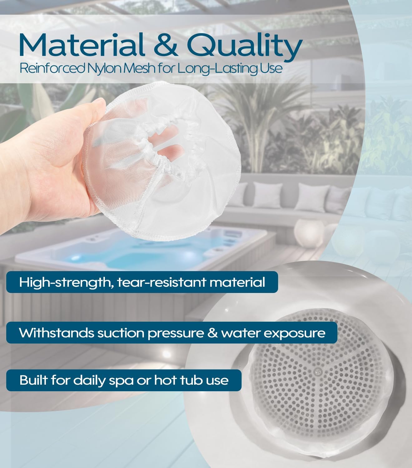 Our spas suction fitting sock made from premium mesh material which is strong and durable, you will get 2pcs drain cover mesh filter.
