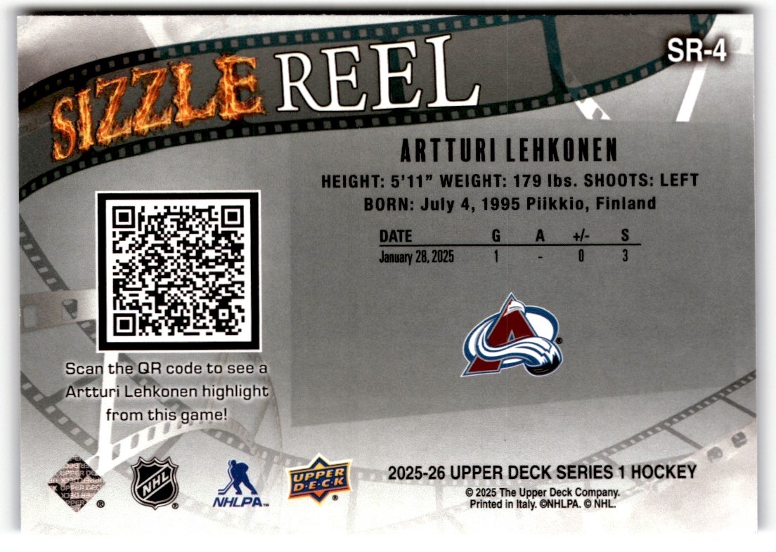| Artturi Lehkonen 2025-26 Upper Deck Sizzle Reel #SR-4 Colorado Avalanche | ||||||||||||||||
