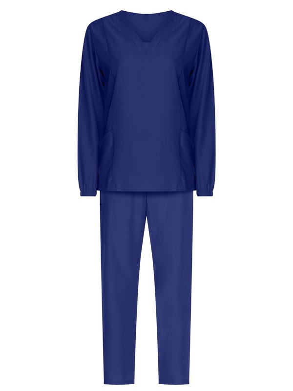 The V-neck long-sleeve top with pockets is both practical and stylish, adding a modern touch to the classic scrub look.