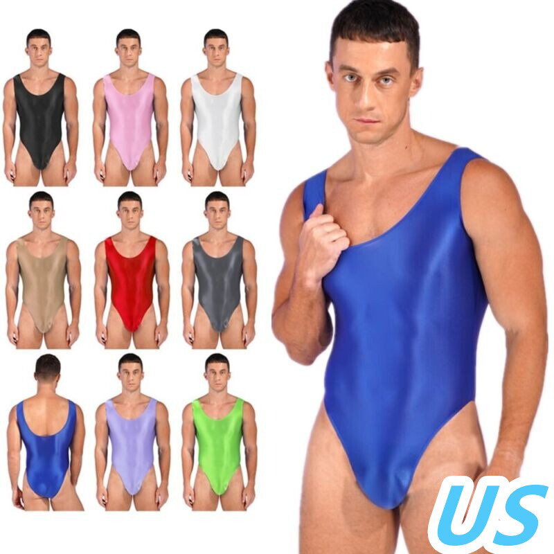 Men’s one-piece singlet tight underwear, shiny patent leather fabric, glossy appearance.
