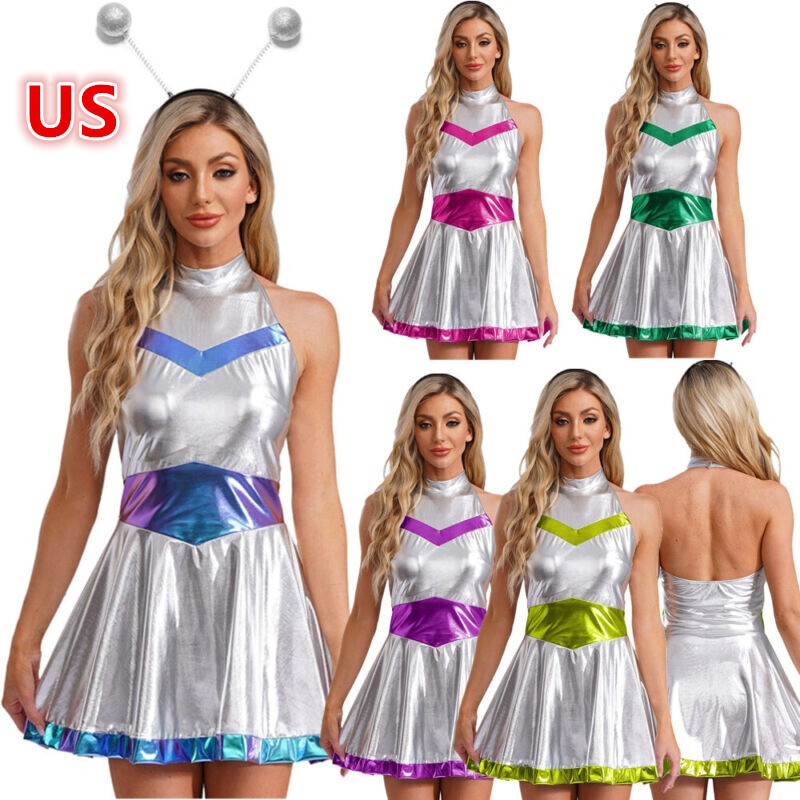 Alien-themed design, with eye-catching colors like blue, shiny silver, green, and hot pink, makes you stand out at the Halloween party and shows your unique personality.
