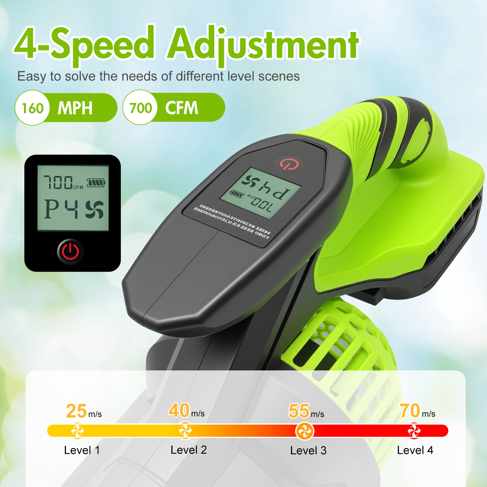 Lightweight & Powerful, Master Your Yard with Ease! This professional-grade leaf blower combines robust performance with user-friendly design. Weighing just approx. 1.8kg and crafted from durable ABS material, it ensures fatigue-free operation and reliable safety. At its heart, turbo boost technology delivers a mighty 700CFM airflow, while its 2-in-1 blower and vacuum functionality tackles everything from yard leaves and industrial dust to fire starting with unmatched versatility. The intelligent 4-speed settings let you fine-tune the power, and the clear LCD screen keeps you informed of the operational status at a glance. Featuring an innovative detachable tube for easy storage and flexible use, plus an efficient cooling grill to prevent motor overheating, this tool delivers sustained power. It's your all-in-one cleaning expert for home and work.