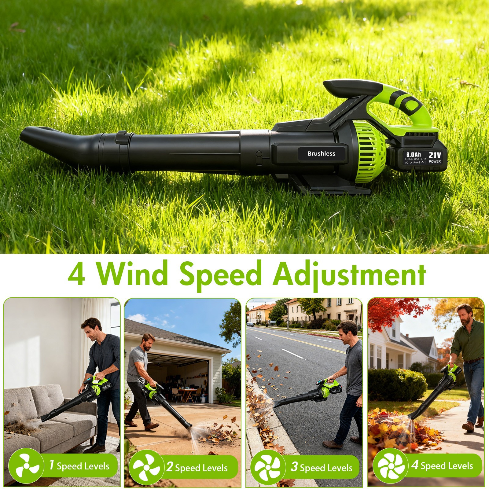 【Turbo Boost & 700CFM Performance】Unleash impressive cleaning power! Equipped with advanced turbo boost technology and an axial fan, this blower generates a massive 700CFM air volume. Powered by a high-performance brushless motor, it offers both vigorous power and extended lifespan, easily handling even wet, matted leaves and demanding cleanup tasks with exceptional efficiency.